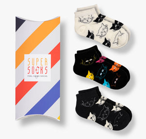 • Stubenrein und ganz zahm: Die Cats Sneaker Box 🐈 für Damen und Herren! Absoluter Tragekomfort im 3er-Set & und obendrein gesellt sich flauschig weiche Haptik zu niedlicher Optik und zusammen (ganz ohne Kratzen) schmiegt sich das feine Gran ultra-weich 🧶 um Fuß und Bein. Rutschfestigkeit wird durch die ergonomische Passform bereitgestellt und die verlässt einen auch nicht. Selbst nach 200 Maschinenwäschen berichten Besitzer:innen noch Freude am Tragen. Apropos: Freude gibts auch Einzeln, denn alle Sneaker Socken sind natürlich als Einzelpaare erhältlich.