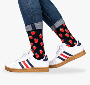 Flauschige 🍋 Zitronensocken, komfortable Erdbeersocken und ein bunter Mix aus Äpfeln und Birnen: Die Fruit Box für Damen und Herren, mit 3D Stretch-Baumwolle und der unverwechselbaren, weichen Haptik schenken absolute Freude am Tragen. Reduzierte Nähte und atmungsaktives Garn 🧶 legen sich zusammen und ganz sanft an Fuß und Bein, wodurch Tragekomfort auch an langen Tagen erlebt werden kann. Drei Paar sind zwei zu viel? Kein Problem, hier gibt’s alle bunten Socken auch als Einzelpaare.