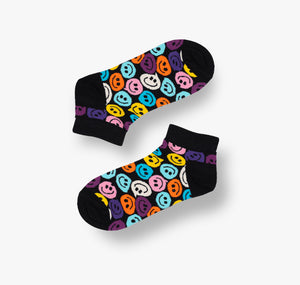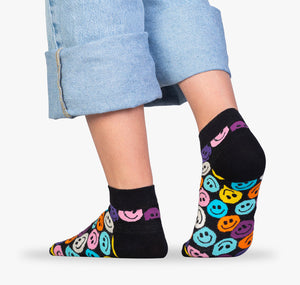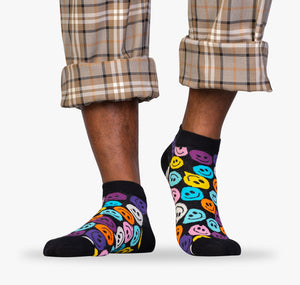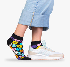 • Funky Smiley Sneaker Socken für Damen und Herren erzeugen gute Laune, egal wie lange man auf den Socken ist. Und apropos Socken: Feine 🧶 Baumwolle, dünnes Garn und schneller Rücktrocknung sorgen für Komfort bei jedem Schritt. Verstärkte Fersenpartien und reduzierte Nähte komplementieren das flauschige Tragegefühl und vereinen, was zusammengehört: Coole Optik und weiche Haptik für Tragespaß von früh bis spät. Unendliche Freude mit Sneaker Socken gibts in der Good Mood Box, mit 3 Paar für gute Laune und Tragespaß von früh bis spät.