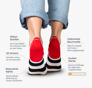 2 Paar Füßlinge – doppelte Freude am Tragen. Dünnes Garn 🧶 und rutschfeste Silikonstreifen an den Fersen, geliefert im Happy Feet 2er-Pack, für coole Füße an heißen Tagen. Unsichtbar in den meisten Turnschuhen, aus gekämmter Baumwolle und mit maximal reduzierten Nähten an Ferse und Zehen, passen bunte Füßlinge zu jedem Style. In unseren Kissenschachteln verpackt und in ausgesuchten Designs erhältlich. Zwei Paar sind eines zu viel? Kein Problem, alle Füßlinge für Damen und Herren sind auch als Einzelpaare erhältlich.