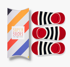3 Paar dünne Füßlinge für Damen & Herren verpackt in einer hochwertigen Kissenschachtel. Absoluter Komfort, Halt und Freude am Tragen oder Schenken. Optisch bestechen die im Schuh unsichtbaren Socken mit rot-weiß-dunkelblauem Streifenmuster und haptisch durch feine Baumwolle 🧶 und ergonomisch geformte Silikonstreifen an den Fersen für optimalen Halt im Schuh ohne zu verrutschen. Verstärkte Teilbereiche mindern Reibung an den Belastungszonen, während schnelle Rücktrocknung und reduzierte Nähte für ein angenehmes Tragegefühl sorgen.
