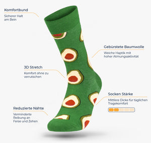 Holy Guacamole! Avocado Socks sind schon beim Frühstück ein absolutes Muss: Echte Kenner:innen tragen die grüne Frucht 🥑 nicht nur im Einkaufskorb, sondern auch am Bein. Weiche Baumwolle, mitteldickes Garn und die ultra-komfortable Unisex Passform lassen Damen und Herren auf Schritt und Tritt alle positiven Eigenschaften 🧶 erfühlen. Und: es gibt noch mehr – nämlich im Avocado Socken 3er-Pack! Alle drei Designs vereint für farbenfrohen Tragekomfort, bestens als Geschenk fürs nächste Guacamole-Dinner-Date geeignet.