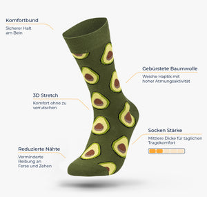 Expertentipp: Avocado Socken 🥑 schmecken komisch, sehen aber verdammt gut aus. Weiche Haptik legt sich an Fuß und Bein, wie das Original auf den Frühstückstoast. Und weil die grüne Frucht fast jeder mag, haben wir das Unisex Prinzip bei unseren Avocado Socken für Damen und Herren übernommen. Mitteldickes 3D Stretch Garn 🧶 und die überlegte Verarbeitung, sorgen für optimalen Tragekomfort während die ergonomische Passform Freude am Tragen schenkt – von früh bis spät. Ein Paar sind drei zu wenig? Kein Problem, hier gibt’s vier Paar in der Muti Box.