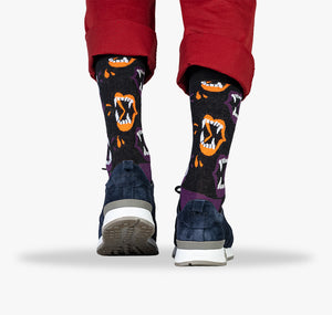 🎃 Halloween Socken 🪁 die schaurigen Wadenbeißer aus Draculas 🧛♂️ Gruft gibt’s nicht nur als Einzelpaar, sondern auch im Funky Skulls 3er-Pack für dreifach gruselig-flauschigen Tragekomfort – und dank der ergonomischen Passform sitzen die Socken auch an ungelenkigen Damen- und Herrenfüßen wie angegossen. Die 3D Stretch Haptik legt sich optimal an Fuß und Bein und lässt auch bei Halloween-Verweigerern einen angenehmen Nachgeschmack in puncto Qualität, Haptik und Optik. Ein Paar sind drei zu wenig? Kein Problem, hier gibt vier Paar im Mixed Double 4er-Pack.