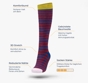 Für Damen und Herren. Bunte Kniesocken aus gekämmter Baumwolle, komfortabler Halt an der oberen Wade. Höchster Tragekomfort von früh bis spät.